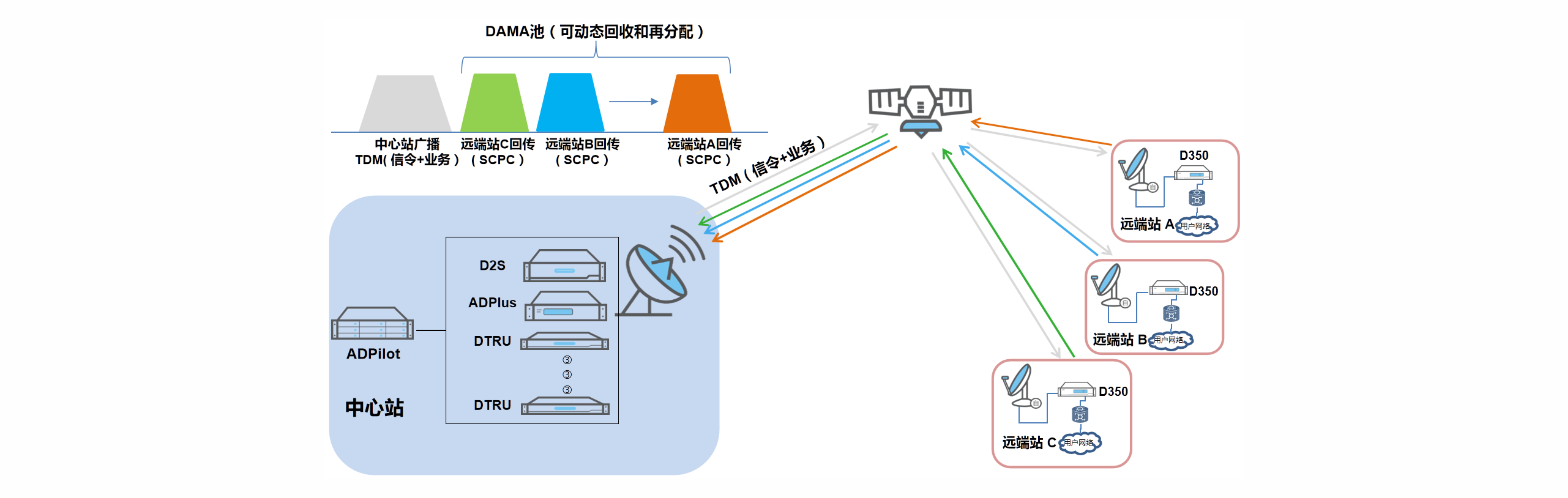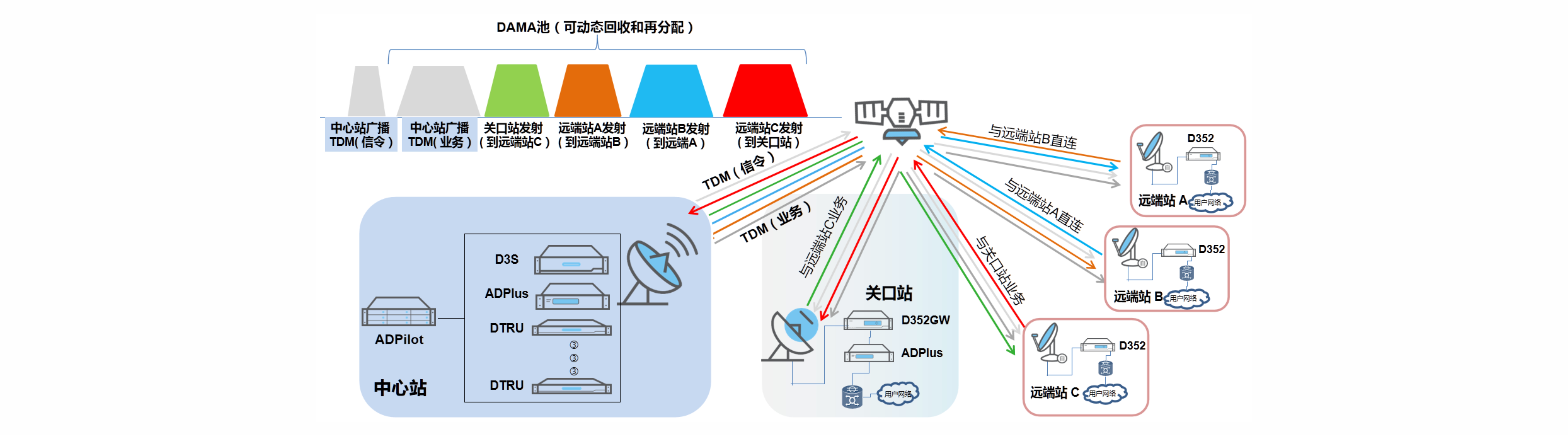 D系列拥有支持标准DAMA的D2S和支持高效DAMA的D3S两套独立的主站产品,分别适用于不同应用场景。高效DAMA模式下,采用信令、业务分离的技术,有效提高网络管理灵活度和信道资源利用率,满足用户多样化的网络拓扑需求。